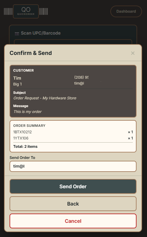 Customer name, company, phone — all captured. Full order summary with every item and quantity. One button to send it.
