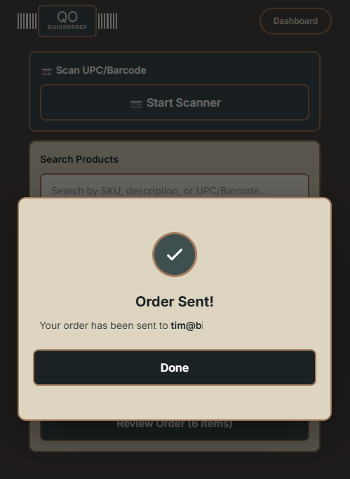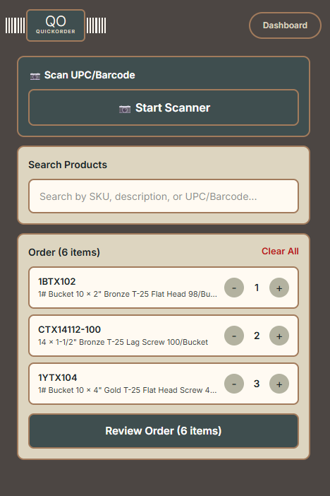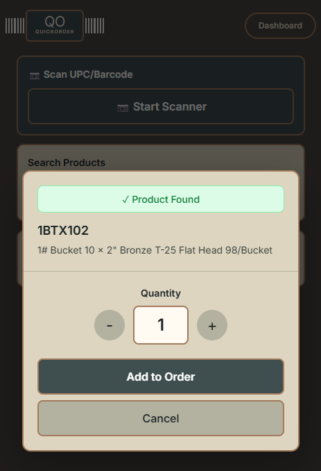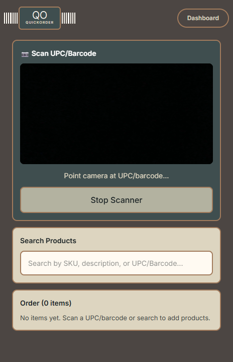 Open QuickOrder on your phone and tap Start Scanner. Aim at any product barcode and it reads instantly. No app to download.