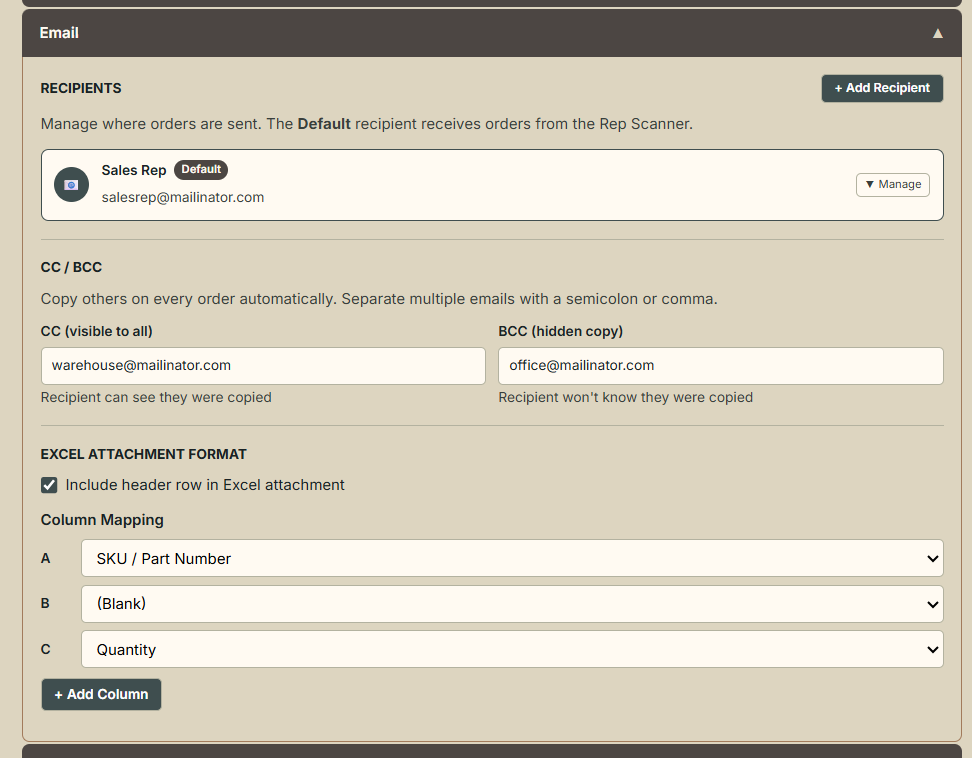 Control exactly how orders arrive in your inbox. Set up recipients, CC/BCC routing, and customize the Excel attachment to match your system.